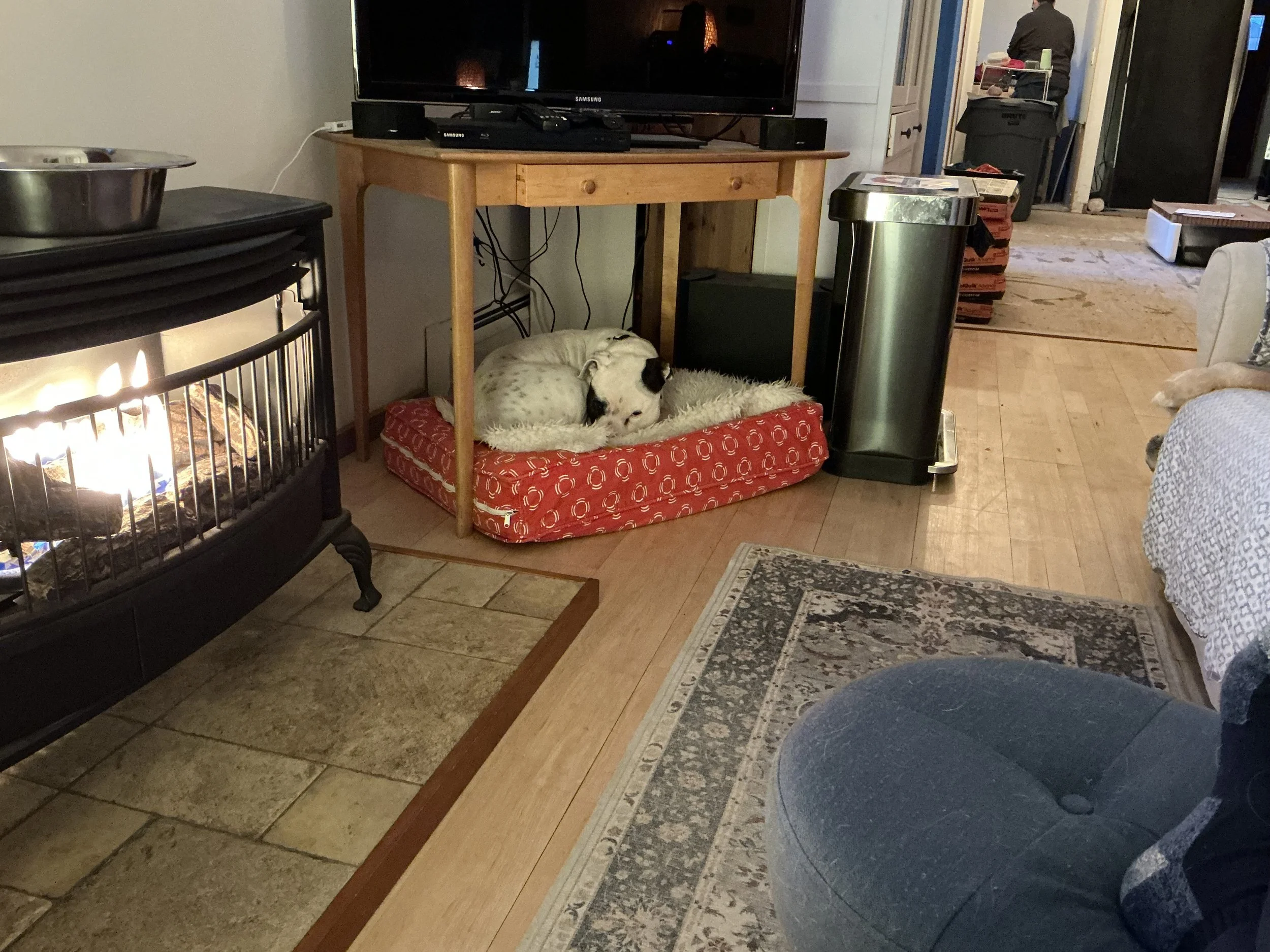 We put this relocated dog bed under the relocated table and TV, and give Daisy and (here) Petey lots of gentle praise for using it rather than plunking down in front of the fireplace, where we would have to step over or around him.