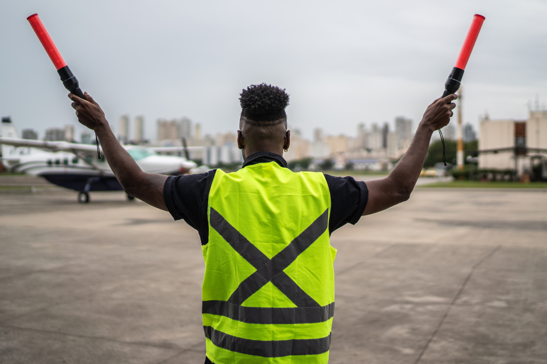 We’re adding hand gestures to Petey’s behaviors (a thumbs-up for “Yes!”, a double-arm-swing like the airport marshal pictured, and extending our hand (which we never stopped doing) for touch